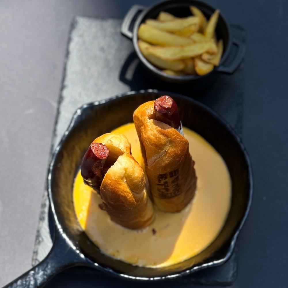250/70/70 г. (Булочка бріош • сосиска копчена • бекон • соус гірчичний та фірмовий білий • сир моцарелла ) • картопляні діпи та екстра сирний соус